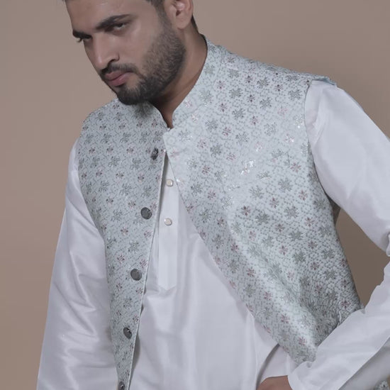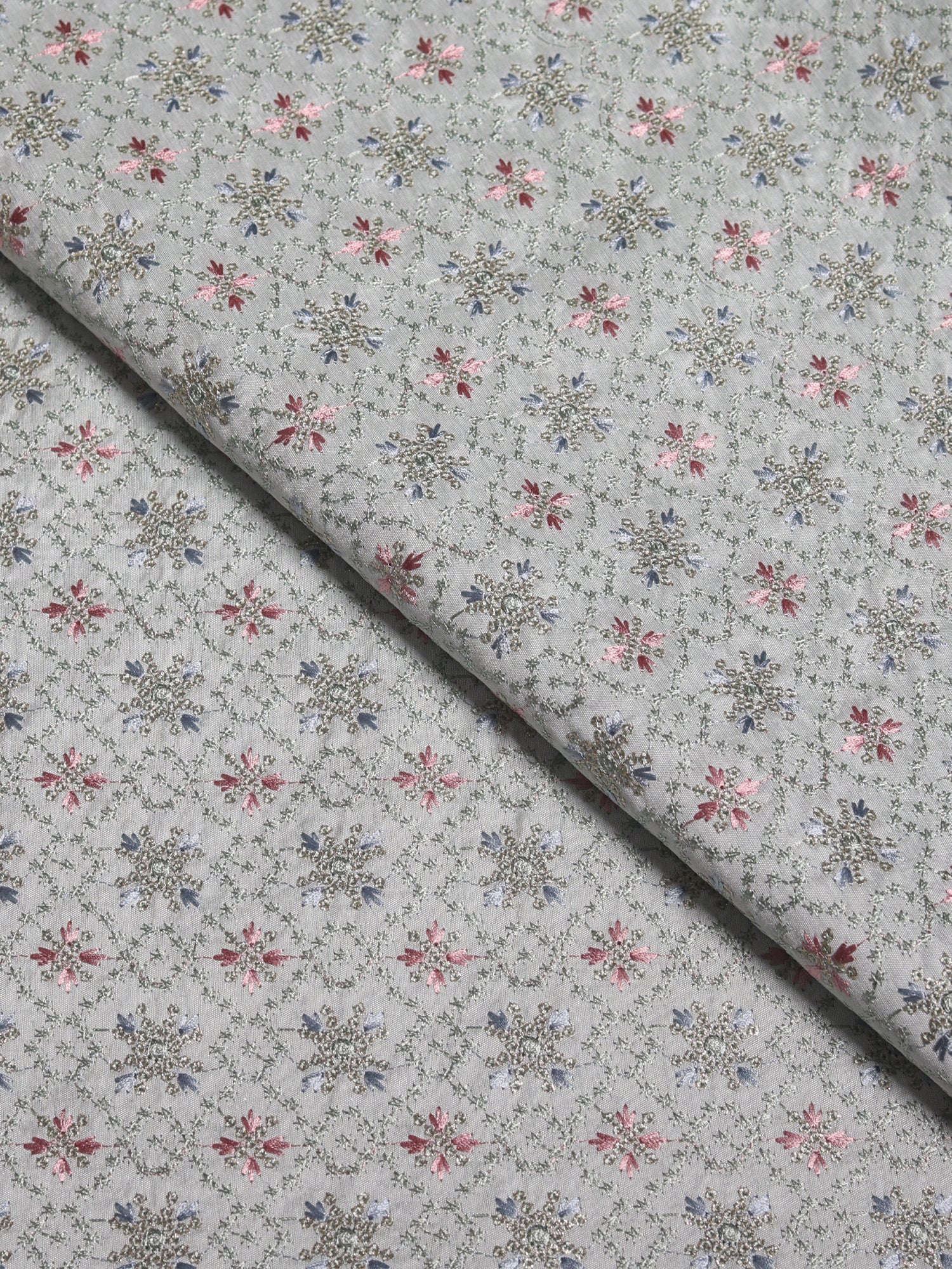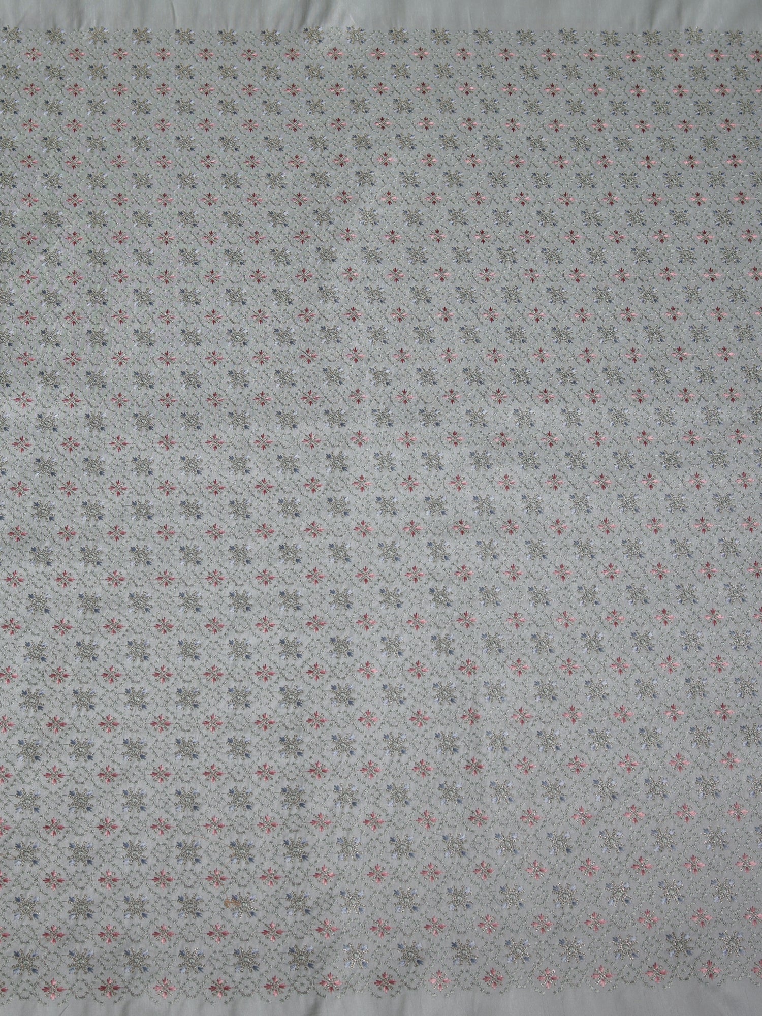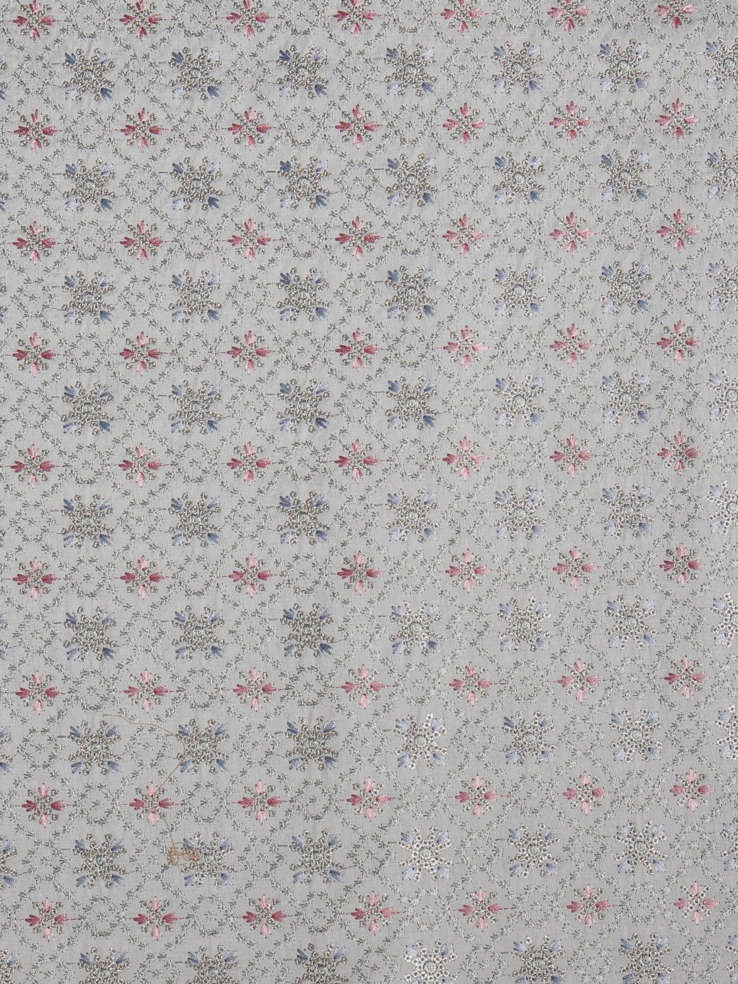 Design: Repeating Floral Medallion Embroidery in Soft Pink, Sky Blue, Olive Green & Metallic Threadwork