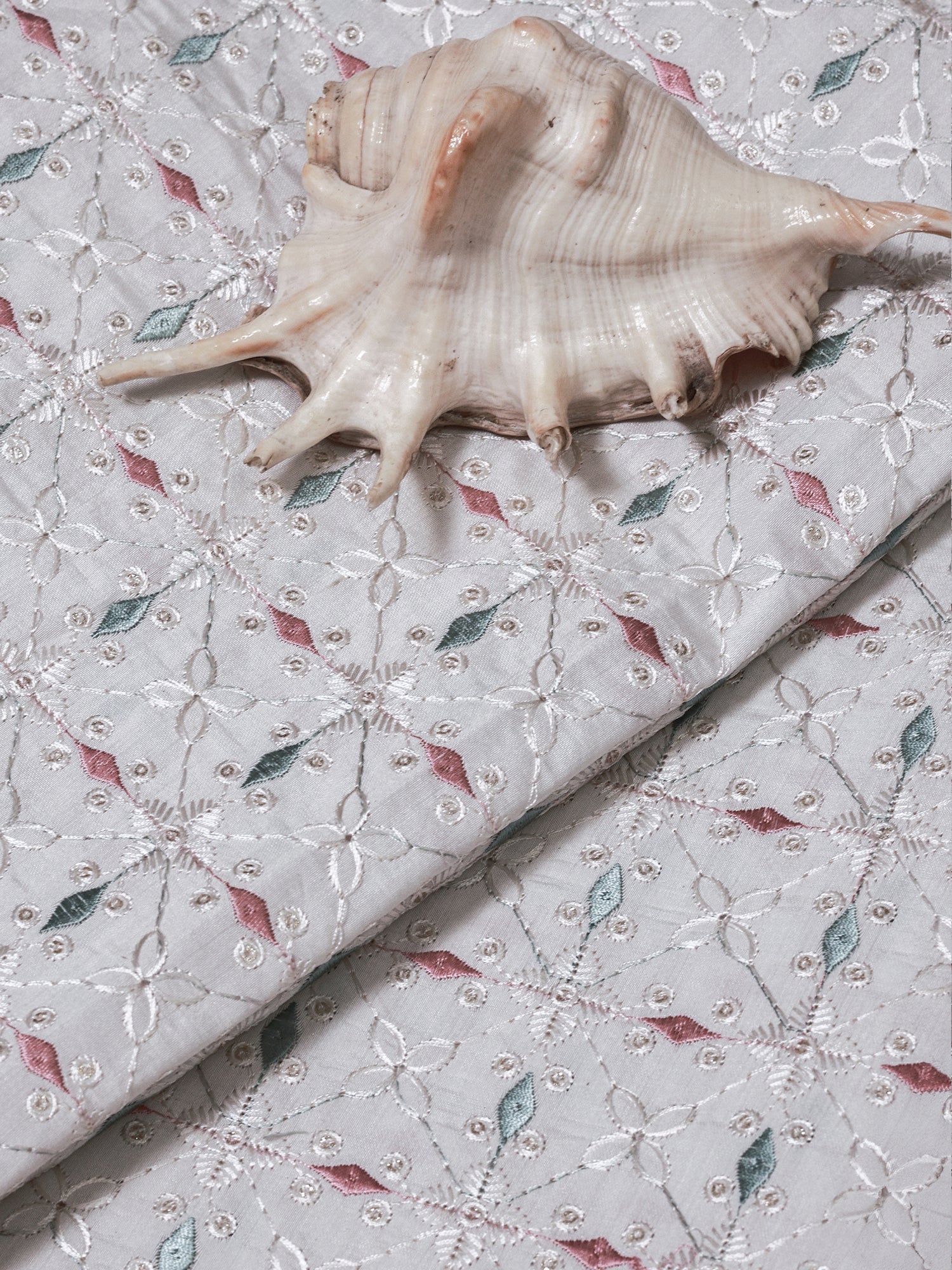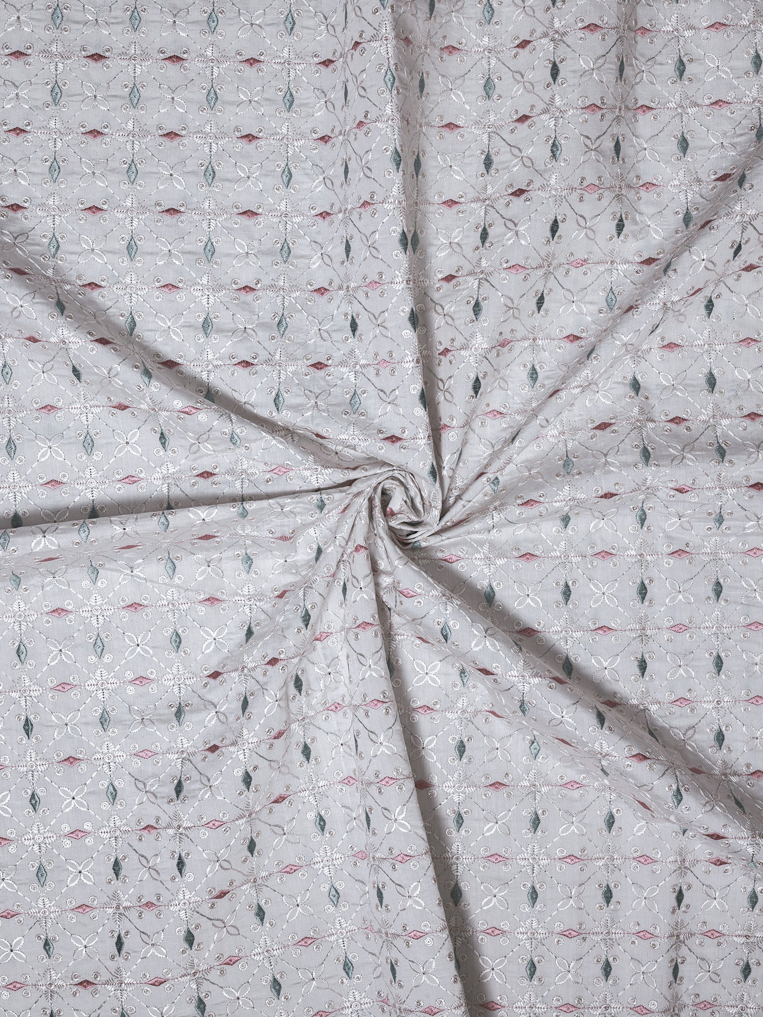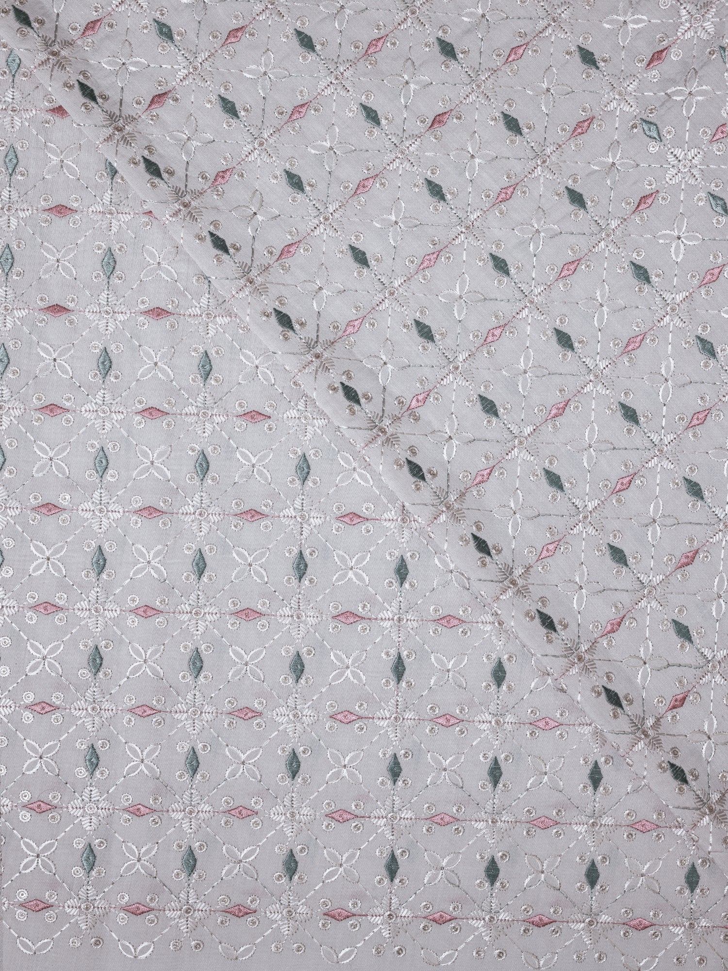 Pastel Floral Embroidered Cotton Fabric – Soft Grey Base with Pink & Green Accents