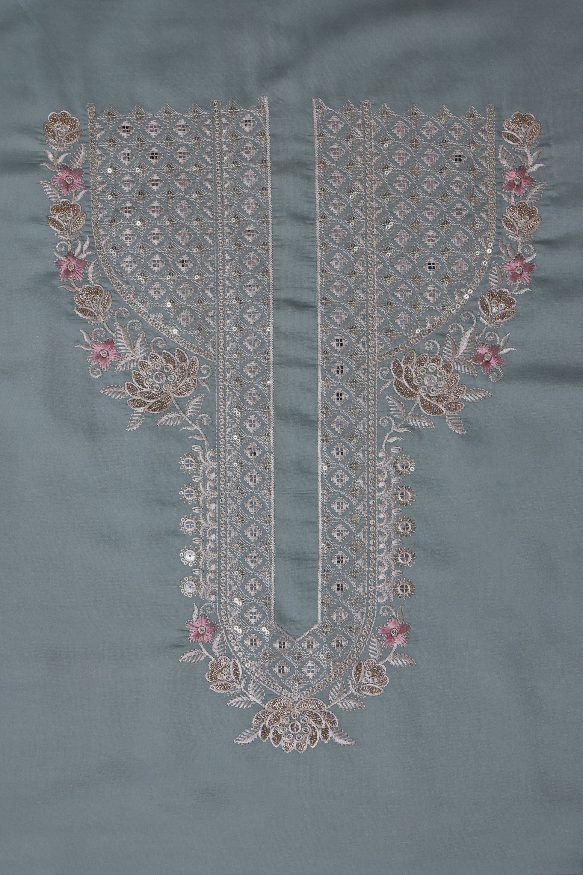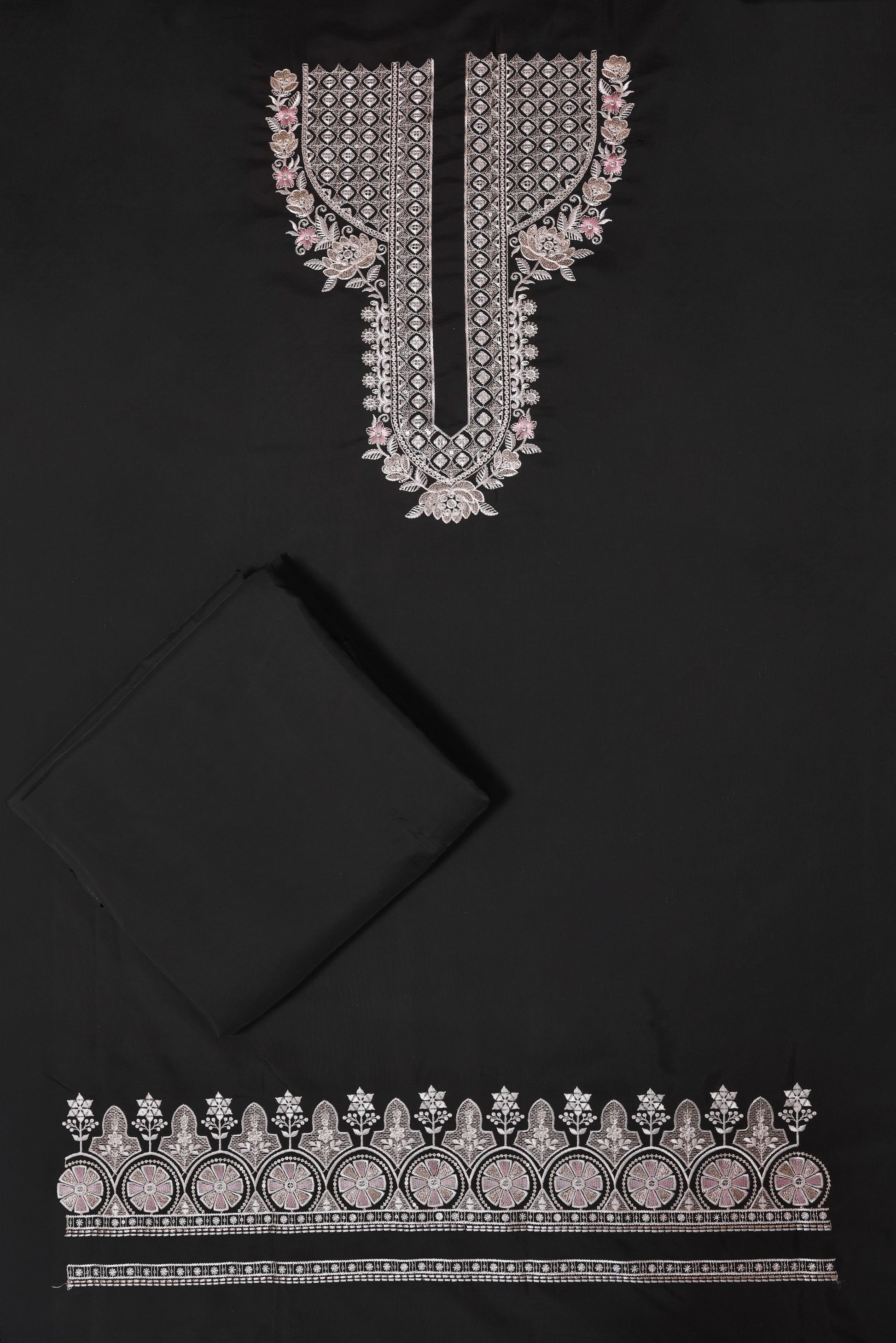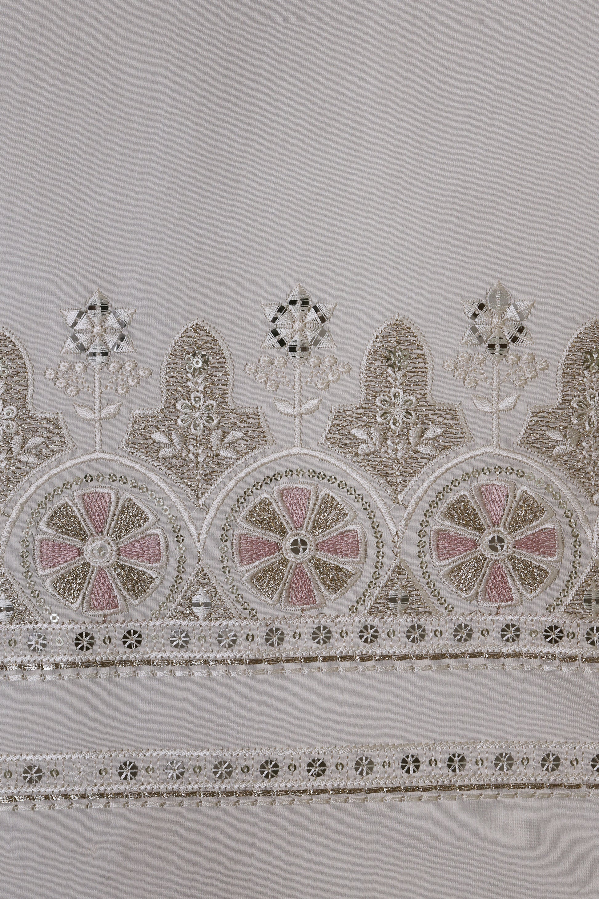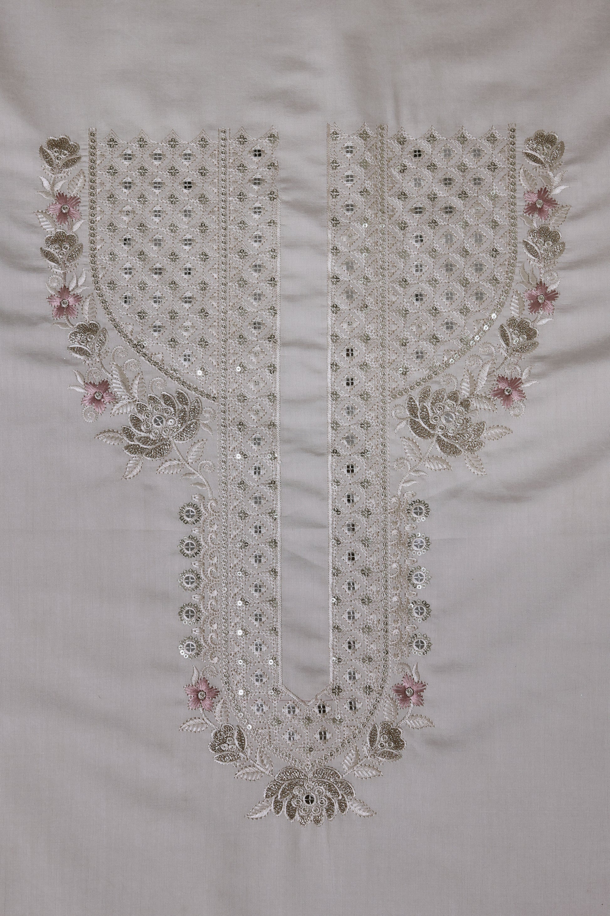 Unstitched Suit with Intricate White & Pink Thread Embroidery – Elegant Neck & Border Design